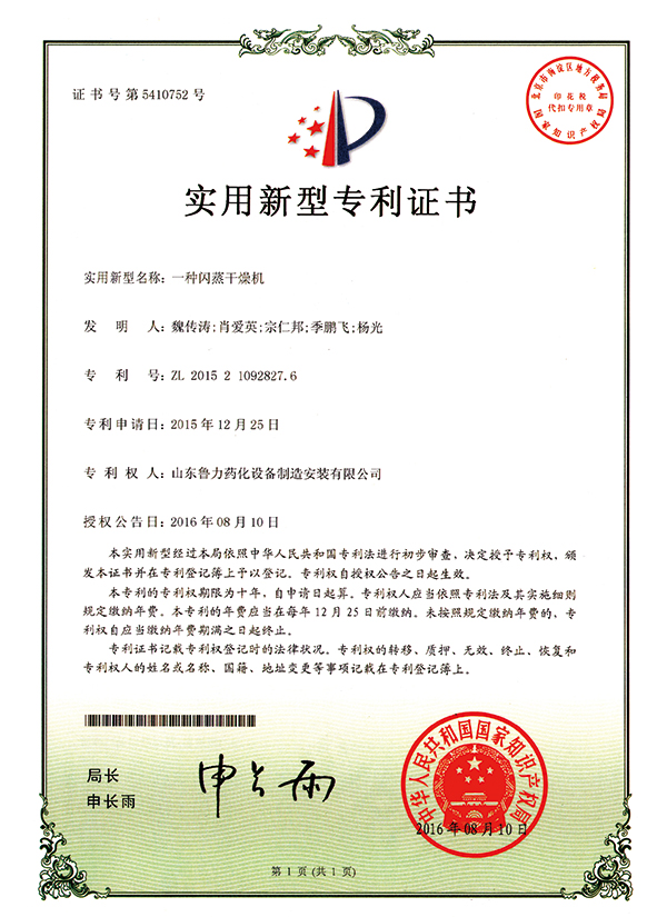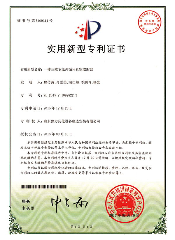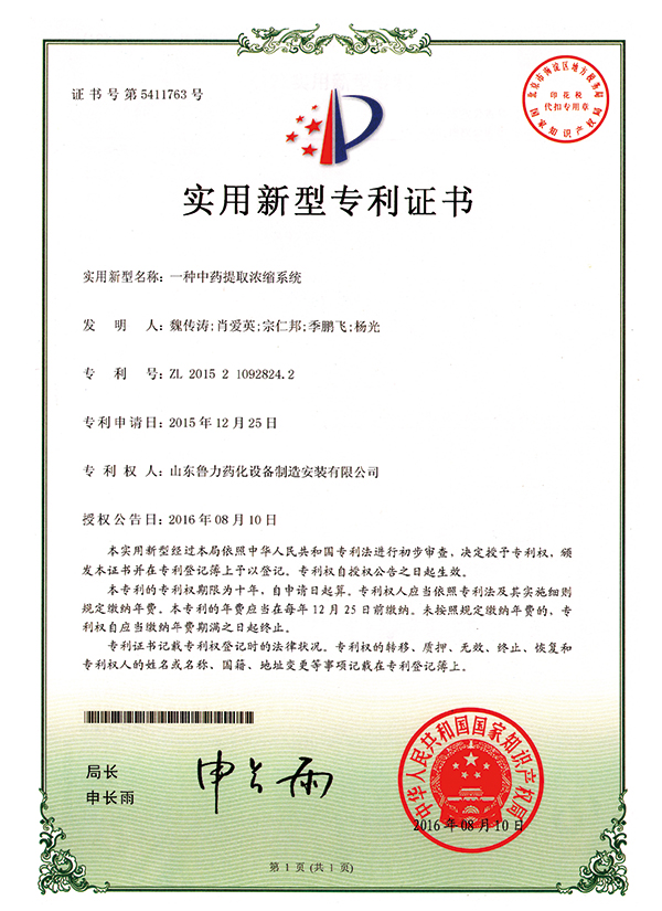 Patent certificate of traditional Chinese medicine extraction and concentration system