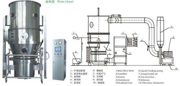 藥品造粒及包衣。造粒:壓片顆粒、沖劑顆粒、膠囊用顆粒。包衣:顆粒、丸劑保護層,備色緩釋、薄膜、腸溶包衣。食品造粒及包衣。炒糖、咖啡、可可粉末、奶油粉末果汁、氨基酸、調味料、膨化食品。農藥、顏料色素、染料造粒。粉狀、顆粒、塊裝物料干燥。