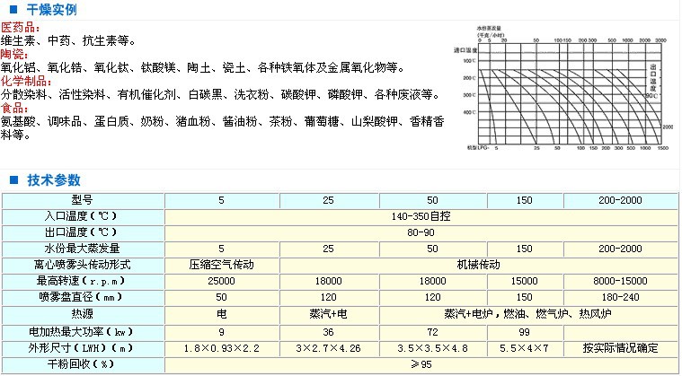 干燥速度快,料液經(jīng)霧化后表面積大大增加,在熱風(fēng)氣流中,瞬間就可蒸發(fā)95%-98%的水份,完成干燥時(shí)間僅需數(shù)秒鐘,特別適用于熱敏性物料的干燥。所有產(chǎn)品具有良好的均勻度、流動(dòng)性和溶解性,產(chǎn)品純度高,質(zhì)量好。操作簡單穩(wěn)定,調(diào)節(jié)控制方便,容易實(shí)現(xiàn)自動(dòng)化作業(yè)。生產(chǎn)過程簡化,適宜連續(xù)控制生產(chǎn)含濕量40%-90%的液體,一次干燥成粉,減少粉碎篩選等工序,操作環(huán)境衛(wèi)生條件優(yōu)越,能避免干燥過程中的粉塵飛揚(yáng)。干燥回收率大于95%。